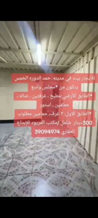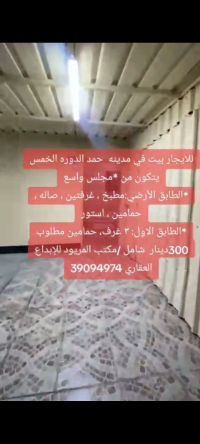 For rent A house in Hamad City, Fifth Round. It consists of a spacious ground floor living room, kitchen, two rooms, a hall, and two bathrooms. The first floor has three rooms and two bathrooms. Required 300 dinars inclusive. Contact Al - Maryood real estate Office