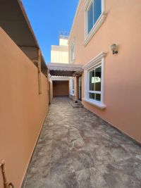 For rent: An elegant villa in excellent condition in Qalali, near Gulf Complex. It consists of 4 rooms, 5 bathrooms, a majlis with a bathroom, a kitchen, a storage room, and a maid's room. It has a spacious living room, a dining room, a garage for one car, outdoor parking, a courtyard, and a wide exterior facade. The villa is 9 years old and fully furnished. Rent: 550 dinars. Phone.