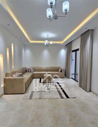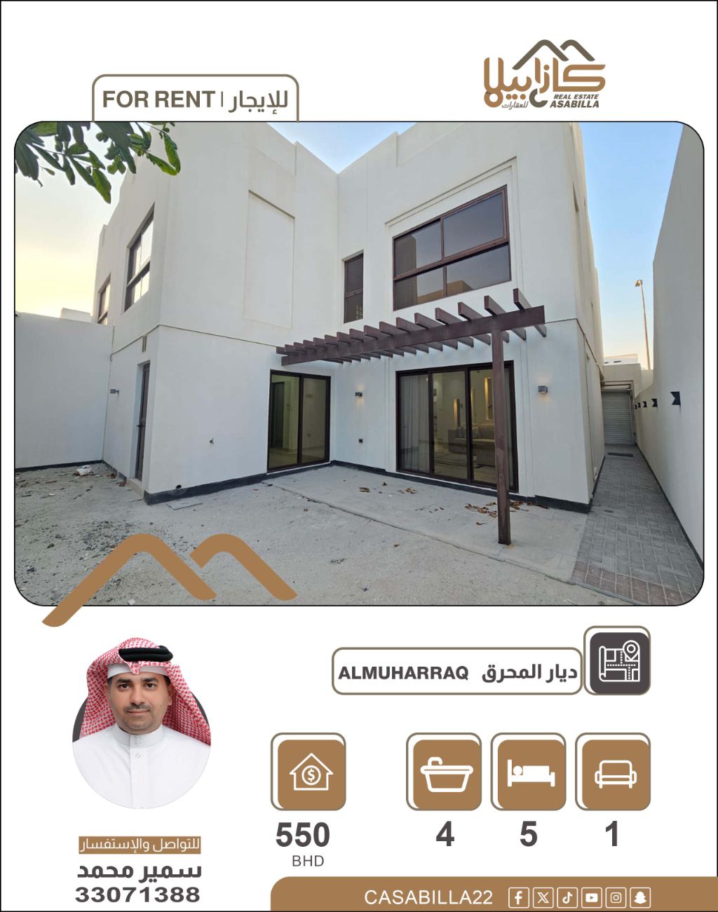 For rent, a new villa including electricity in a quiet area in Diyar Al Muharraq, first occupant, with air conditioners and other details. First, villa details: 1 private men's majlis, 1 spacious family living room, 4 bedrooms, 4 bathrooms, 1 large kitchen, 1 storage room. Second, facilities and services: split air conditioners, curtains, car parking shaded, backyard behind the villa, near the mosque. Third, rent: 550 dinars including electricity, deposit 50 dinars. For more information, contact.