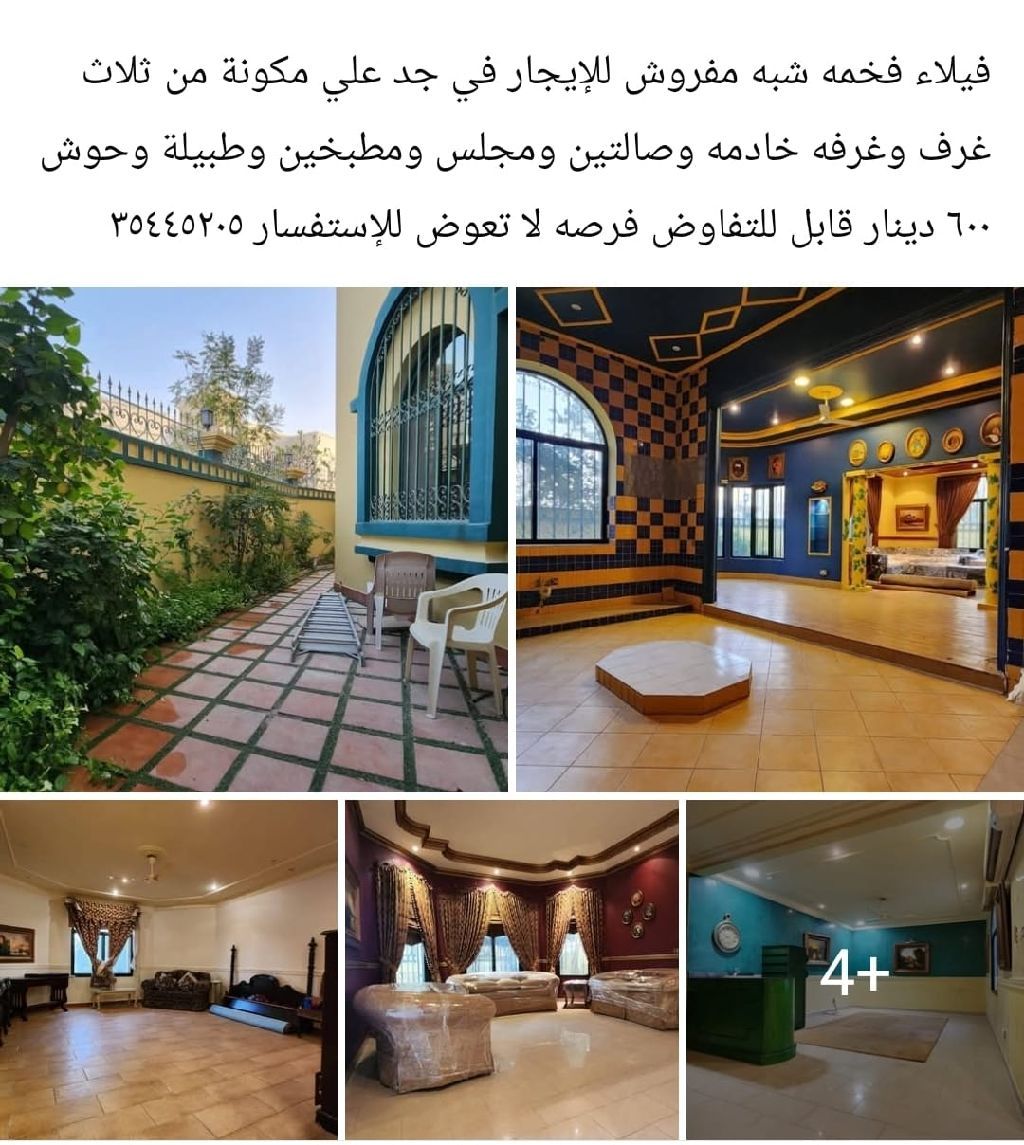 A luxurious semi-furnished villa for rent in Jid Ali, consisting of three bedrooms, a maid's room, two living rooms, a majlis, two kitchens, a roof terrace, and a courtyard. 600 dinars, negotiable. An unmissable opportunity.