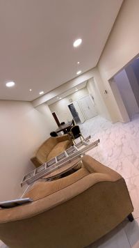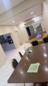 For rent: a two-story house in Riffa, Abu Quwara, includes electricity and water, and is equipped with air conditioning. It consists of 5 bedrooms, 2 large living rooms, 4 bathrooms, 2 kitchens, a laundry room, front and back gardens, a garage, and a shaded outdoor parking space. The price is 550 dinars, including electricity and water.