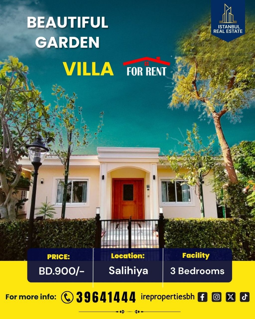 A beautiful garden villa for rent in Al-Salhiya, near Al-Salmaniya, for 900 Bahraini dinars. This semi-furnished luxury villa offers a distinguished lifestyle in a prime location. Enjoy the perfect blend of peaceful garden living and absolute urban comfort. Key features of the villa include 3 spacious bedrooms and 4 bathrooms, an elegant living area and formal dining area, a modern spacious kitchen, a separate laundry room, a shared pool and gym, and covered parking.