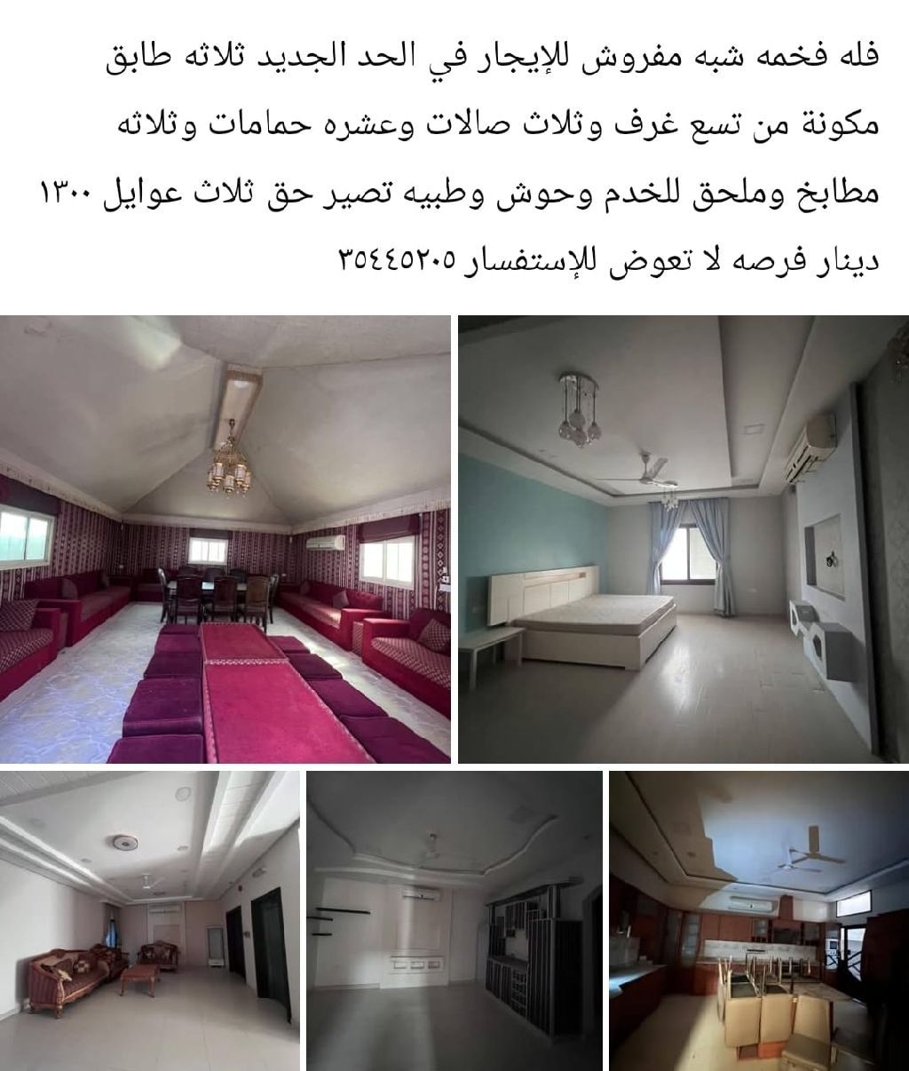 A luxurious semi-furnished villa for rent in Al-Hadd Al-Jadeed, consisting of three floors with nine rooms, three living rooms, ten bathrooms, three kitchens, a domestic staff annex, a courtyard, and a terrace suitable for three families. 1300 dinars, an unmissable opportunity.