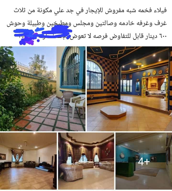 A luxurious furnished villa in Jid Ali, consisting of three bedrooms, a maid's room, two living rooms, a majlis, two kitchens, a roof terrace, and a 600 square meter courtyard. Price is negotiable. An unmissable opportunity.