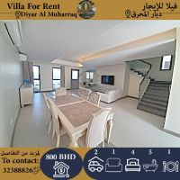 For rent, a villa in Diyar Al Muharraq with 4 bedrooms, 5 bathrooms, a kitchen, a large living room, two storage rooms, a garage for two cars, a garden, with air conditioners and curtains. Price: 800 Bahraini dinars. For contact: Al Burj Al Jadeed Real Estate.