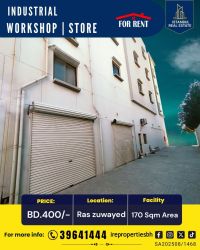 ورشة صناعية/مخزن للإيجار في راس زويد بالقرب من عسكر بسعر 400 دينار بحريني. يقع هذا العقار (الورشة) في راس زويد بالقرب من عسكر، بمساحة 170 متر مربع تشمل طابق نصفي، مساحة للمكتب، وحمام. سهولة وصول الشاحنات والمقطورات. يمكن استخدامه مع سجل تجاري، وهو مناسب لأي نوع من الورش الصناعية أو المخازن. سهولة الوصول إلى الطريق السريع المؤدي إلى ألبا، عسكر، سترة، عكر، المنامة، المحرق، وغيرها. الإيجار 400 دينار بحريني.