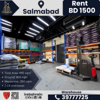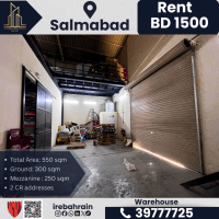 مستودع/ورشة للإيجار - سلماباد. الإيجار: 1500 دينار بحريني شهرياً. المساحة الإجمالية: 550 متر مربع. الطابق الأرضي: 300 متر مربع. طابق الميزانين: 250 متر مربع. يقع على طريق ذو وجهين (مدخل أمامي وخلفي). مناسب لمعرض/مستودع/ورشة عمل. يتوفر اتصال EWA على 3 مراحل. خيار لعنوانين للسجل التجاري. سهولة الوصول إلى الطرق الرئيسية والمرافق القريبة. مثالي لرؤية الأعمال والعمليات. للتواصل.