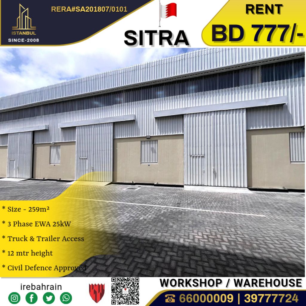 مستودع/ورشة/مصنع قياسي للإيجار في سترة، منطقة الم عمير، بسعر 777 دينار بحريني. يقع هذا المستودع المجهز تجهيزاً كاملاً في منطقة الم عمير الصناعية المزدهرة في سترة، بمساحة إجمالية تبلغ 259 متراً مربعاً وارتفاع 12 متراً، مما يجعله مثالياً لإنشاء طابق نصفي لزيادة المساحة القابلة للاستخدام. المستودع معتمد بالكامل من قبل الدفاع المدني ومصمم خصيصاً للخدمات اللوجستية الثقيلة، ويسهل دخول الشاحنات والمقطورات إليه.