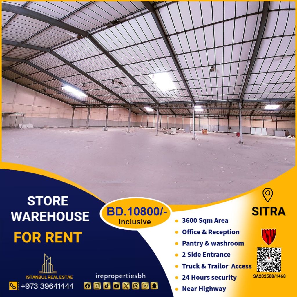 A warehouse for rent in Sitra near the Highway for 10800 Bahraini dinars. This warehouse is located in Sitra near the Highway. It has an area of 3600 SQM and includes 3 - phase electricity, and it can be used with a commercial registration. It is suitable for any shop, warehouse, office room, reception, small storage, bathroom, and rest area. easy access for trucks and trailers. easy access