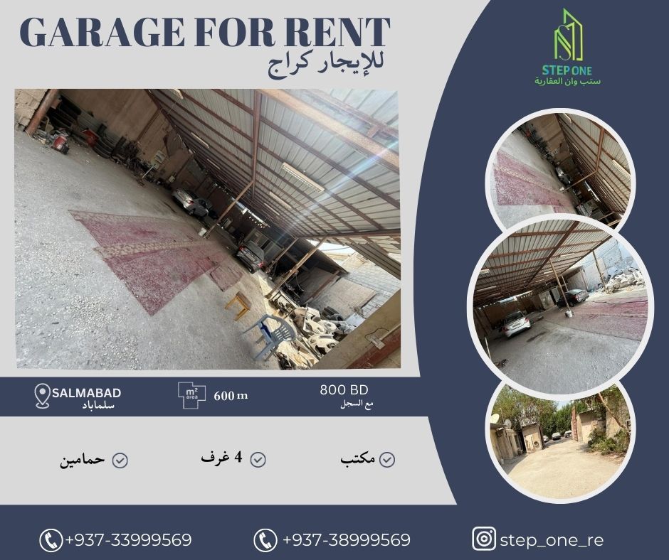 For rent: A car maintenance garage in Salmabad with registration, area 600m, excellent location with four rooms, two bathrooms, and an office. Price 800 dinars, negotiable. Contact.