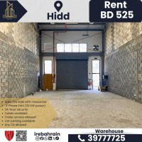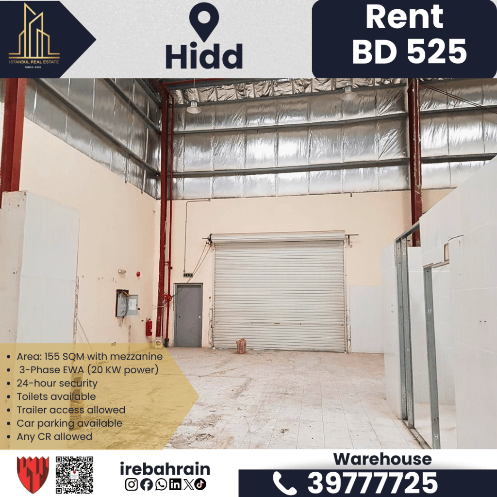 Workshop/Warehouse/Factory for rent in Al Hidd, 525 Bahraini Dinars. Location: Al Hidd (BIW). Area: 155 square meters with a mezzanine floor. Three-phase electricity (20 kW). 24/7 security. Toilets available. Trailer access available. Parking available. All types of toilets permitted. Easy access to the port, airport, Juffair, and Manama. Rent: 525 Bahraini Dinars per month.
