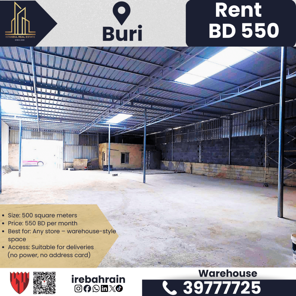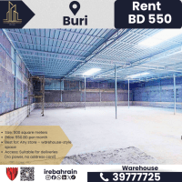 Warehouse/Shop for rent in Bouri - 500 square meters - 550 Bahraini dinars only. Location: Bouri - Easy access to Hamad City, Hamala, Riffa, Salmabad, and Aali. Area: 500 square meters. Price: 550 Bahraini dinars per month. Suitable for any type of shop - warehouse-style space. Easy access, suitable for delivery (without electricity, without address card). Conditions: Cannot be used as a commercial registration address. For contact, call.