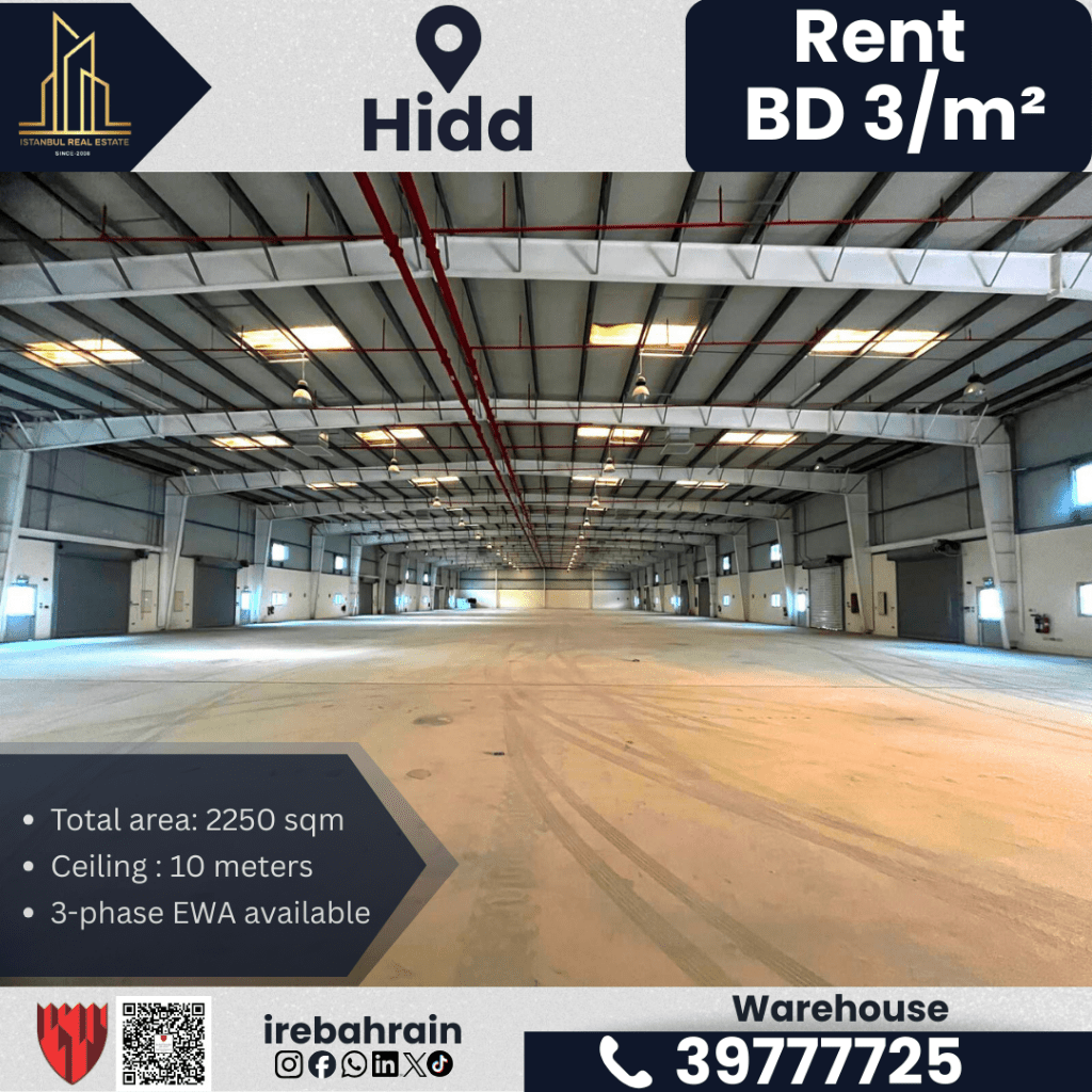 Commercial warehouse/workshop for rent in the Hidd Industrial Area - 3. Monthly rent is 3 Bahraini dinars per square meter (total 6750 Bahraini dinars, excluding water and electricity bills). Location: Hidd Investment Quay. Total area: 2250 square meters. Ceiling height: 10 meters. Available facilities: restroom, entrance for trucks and trailers, 24-hour security. Electricity and water services are available with three phases. Any commercial address can be used. Easy access.