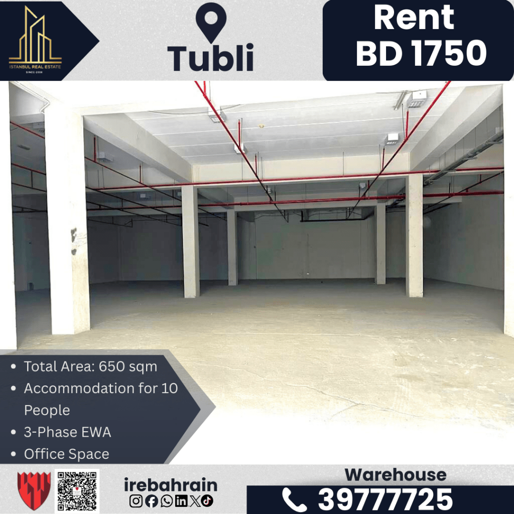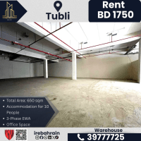 Workshop, warehouse, and shop for rent in Tubli - 1750 Bahraini dinars. Total area 650 square meters. Warehouse/storage area, office space, accommodation for 10 people, toilet, electricity and water, three-phase power, entrance for trucks and trailers, 24-hour security, any residential address accepted. Prime location - Tubli, easy access to the highway, Salmabad, Manama, and Sitra. Rent 1750 Bahraini dinars per month (excluding electricity and water). For contact.