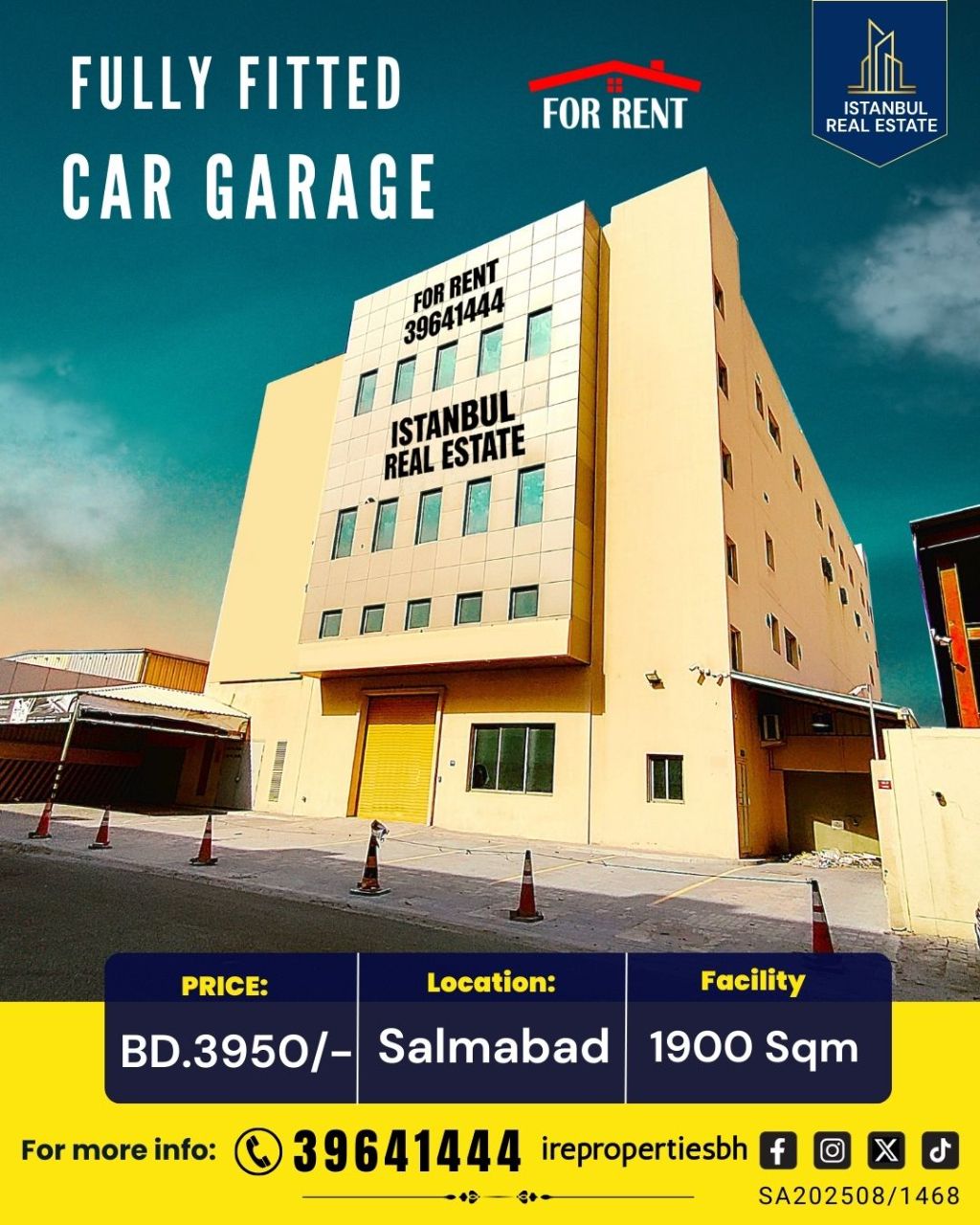 A fully equipped car garage for rent in Salmabad. 3950 Bahraini Dinars / Ready to start immediately. A fully equipped car garage and workshop consisting of 3 floors in a prime location in Salmabad. Property features: Total area 1900 square meters. Main facilities: Passenger elevator, 2 industrial car lifts, dedicated section for bodywork and painting, office and storage room, small kitchen and bathroom. Infrastructure: Central air conditioning, water desalination station, compressors, imported high-quality machines.