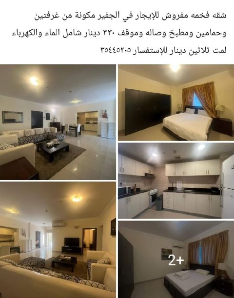 شقة فاخرة مفروشة للإيجار في الجفير، تتكون من غرفتين وحمامين ومطبخ وصالة وموقف. 330 دينار شامل الماء والكهرباء لمدة ثلاثين يوماً.