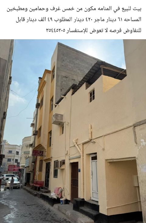 A house for sale in Manama consisting of five rooms, two bathrooms, and two kitchens. The area is 61 square meters. The monthly rent is 420 dinars. The asking price is 49,000 dinars, negotiable. An unmissable opportunity.