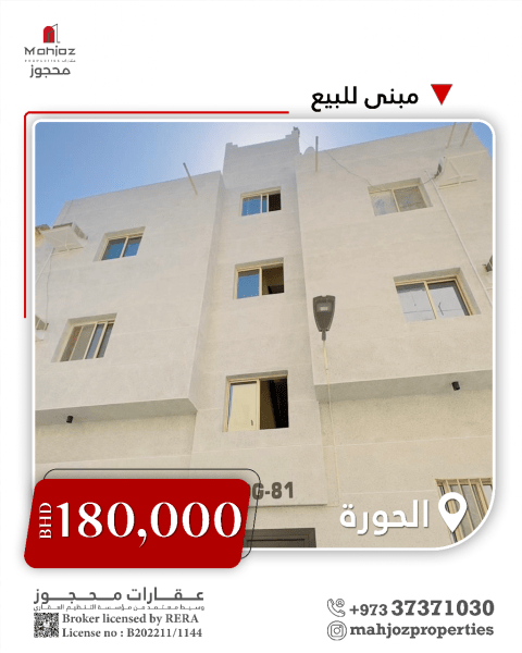 For sale: A new building in Al-Salhiya (Al-Qafool), key handover, behind Al-Hawaj shops, behind Al-Ittihad Insurance Company. It includes 4 apartments, car parking, 2 apartments with 3 bedrooms, a living room, 3 bathrooms, and 2 kitchens; 1 apartment with 2 bedrooms, 2 bathrooms, a living room, and 2 kitchens; 1 apartment with 1 bedroom, 1 bathroom, and 1 kitchen. Land area is 201 square meters, building area is 450 square meters, complete electricity meters. Price is 147,000 Bahraini dinars (negotiable). Contact us for more information: 00973.