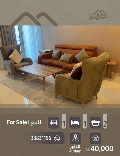 للبيع: شقة مفروشة بالكامل في الجفير بالقرب من فونتانا تاور. تحتوي على غرفتين، حمامين، مطبخ، صالة، وبلكونه في الدور الأخير مع جميع الخدمات الترفيهية والأمنية. المساحة 117 متر مربع، السعر 53 ألف دينار بحريني، تملك حر لجميع الجنسيات.