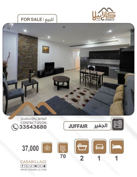 للبيع شقة فاخرة في الجفير تحتوي على غرفة نوم وصالة وحمام ومطبخ. مساحة 70 متر مربع بسعر 37500 دينار بحريني