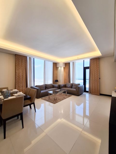 شقة استوديو فاخرة مفروشة بالكامل للإيجار في الجفير. تحتوي الشقة على شرفة مطلة على البحر. تشمل المرافق مسبحا وصالة ألعاب رياضية وغرفة بخار وساونا وسينما وسكواش وغرف ألعاب وغير ذلك الكثير. الإيجار 280 دينارا بحرينيا، بما في ذلك 20 دينارا بحرينيا لرسوم الكهرباء والماء. يرجى الاتصال