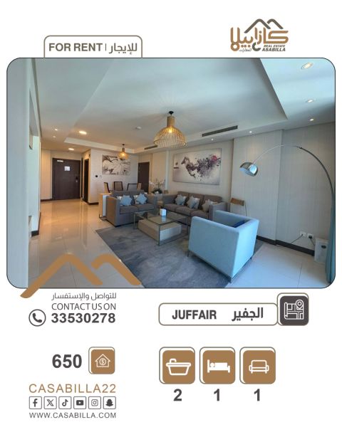A modern apartment for rent in Juffair, high floor with a stunning view, two bedrooms. Enjoy living on the 21st floor in the heart of Juffair. The apartment features a practical design and comfortable spaces, providing you with tranquility and privacy along with a distinctive view. It consists of two bedrooms + laundry room - living room, two bathrooms - balcony. Price 550 - 530 dinars, electricity limit 40 dinars. For contact.