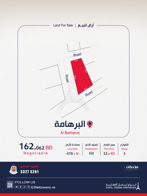 Eiffel Towers Real Estate Company offers for sale a land in Al-Barhama with an area of 470.5 square meters. Classification: Private Residential (RB). Price per square foot: 32 Bahraini dinars. Total price: 162,062 Bahraini dinars. For contact: Mahmoud Al-Sadiq, eiffeltowers.re, eiffeltowers.re. Licensed broker approved by the Real Estate Regulatory Authority, license number B202403/1257.