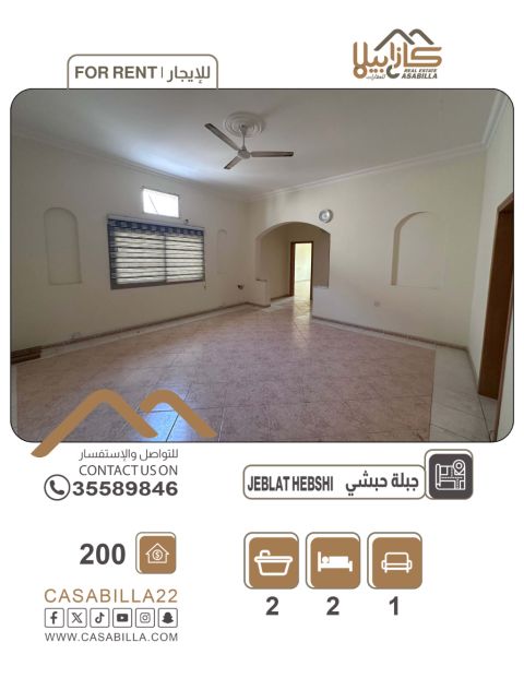 Office apartment for rent - Jabala Habshi, second floor - with elevator, consisting of two rooms, a hall, a kitchen, and two bathrooms. Area: 100 square meters. Rental price: 200 Bahraini dinars only. Suitable for offices and companies. For contact and inquiries, private.