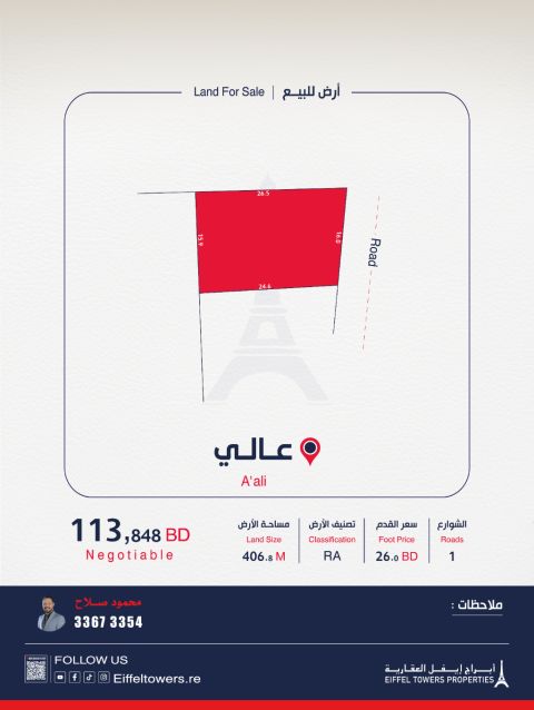 Eiffel Towers Real Estate Company offers for sale a high-area land of 406.8 square meters, classified as private residential (A RA). Price per foot is 26 Bahraini dinars, total price is 113,848 Bahraini dinars. For contact: Mahmoud Al-Sadiq, eiffeltowers-re, eiffeltowers.re, licensed broker approved by the Real Estate Regulatory Authority, license number B202403/1257.