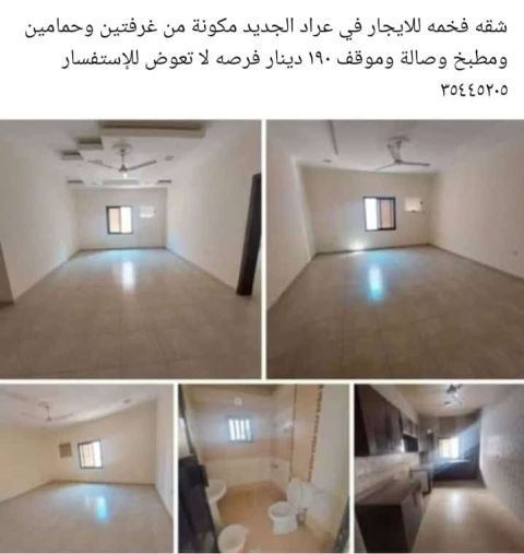 A spacious apartment for rent in Riffa Abu Quwara, consisting of two bedrooms, two bathrooms, a kitchen, a living room, and a parking space. Prices start from one dinar.