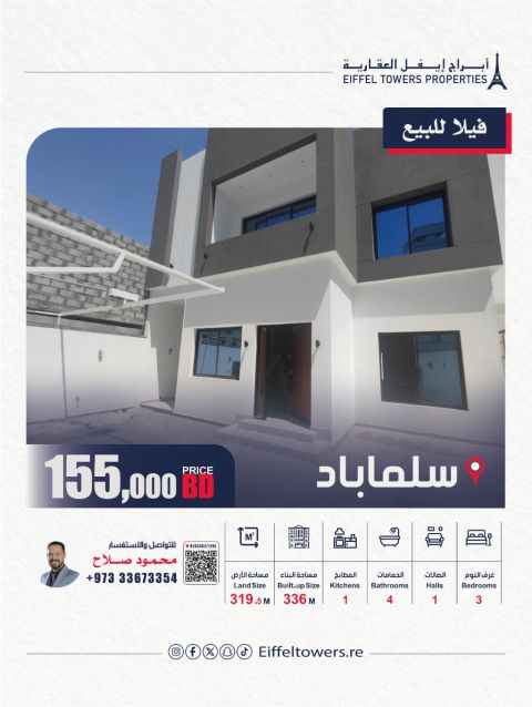 شركة أبراج أيفل العقارية تقدم فيلا جديدة للبيع في سلماباد. مساحة الأرض: 319.5 متر مربع. مساحة البناء: 336 متر مربع. تفاصيل الفيلا: تتكون من طابقين، وتحتوي على 3 غرف نوم، وصالة واحدة، ومطبخ واحد، و4 دورات مياه، وموقفين للسيارات. مميزات إضافية: غرفة غسيل، وغرفة تبديل، وقربها من جميع الخدمات. السعر الإجمالي: 155,000 دينار بحريني. للتواصل: محمود صلاح، eiffeltowers.re، وسيط معتمد من قبل مؤسسة التنظيم العقاري.