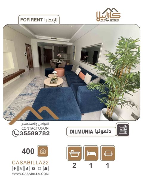 For rent: An apartment in Delmonia. A luxurious apartment in a quiet and beautiful area, consisting of one bedroom, two bathrooms, a living room, a kitchen, and a balcony. Features include a gym (fitness center), a swimming pool, internet available, and a prime location in an upscale area. Monthly rent is 400 dinars. Electricity is 40 dinars. For contact and inquiries.