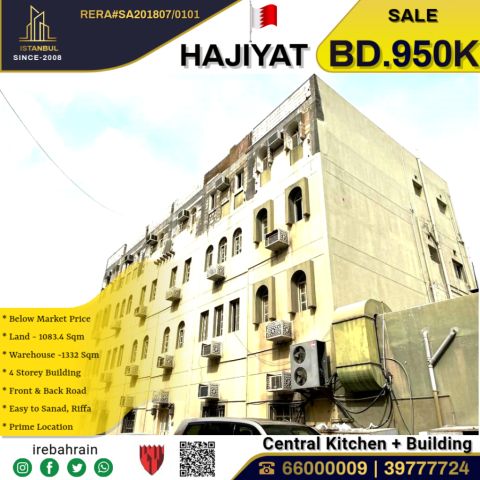 ورشة عمل ومطعم مع سكن عمال مكون من 4 طوابق مبنى للبيع في حجيات الرفاع - 950000 دينار بحريني. يتكون هذا العقار التجاري من ورشة عمل مع ميزانين (1332 متر مربع) ومطعم واحد، وسكن عمال يتكون من 26 غرفة عمال، 22 حمام، 8 مطبخ، و8 قاعات. مساحة الأرض 1083.4 متر مربع، بطريقين، بالقرب من طريق الاستقلال السريع، مع سهولة الوصول الى ألبا، باب كو، سترة، الرفاع، الخ. نقدمه بسعر 950000 دينار بحريني