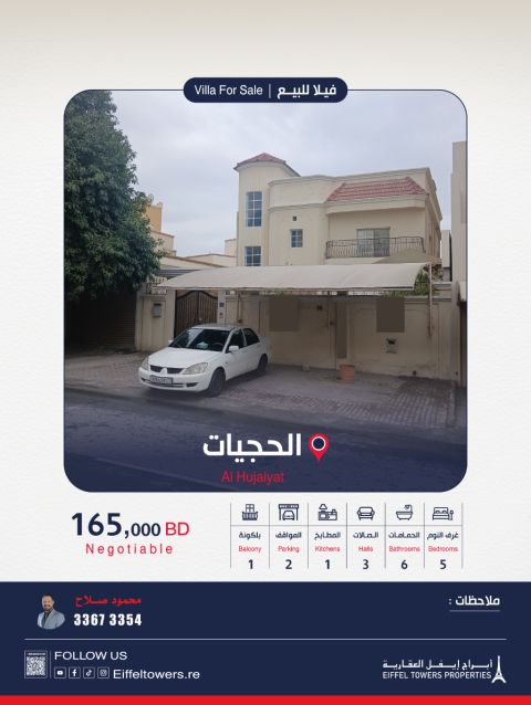 شركة أبراج أيفل العقارية تقدم فيلا للبيع في الحجيات. مساحة الأرض: 375 متر مربع. مساحة البناء: 330 متر مربع. تفاصيل الفيلا: طابقين، 5 غرف نوم، 3 صالات، 1 مطبخ، 2 كراج، 6 دورات مياه. مميزات إضافية: غرفة خادمة، حديقة خارجية، مواقف خارجية تتسع لـ5 سيارات. السعر الإجمالي: 165,000 دينار بحريني. للتواصل: محمود صلاح، eiffeltowers.re، وسيط معتمد من قبل مؤسسة التنظيم العقاري.