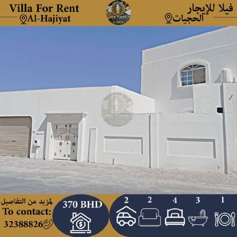 للإيجار فيلا في الحجيات، 4 غرف نوم، 3 حمامات، مطبخ، صالتين، كراج لسيارتين. السعر: 370 دينار بحريني. للتواصل: البرج الجديد للعقارات.