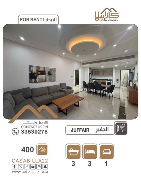 شقة مفروشة للإيجار في الجفير، تشمل الكهرباء. تتكون الشقة من غرفة نوم، صالة، مطبخ، حمام، بركة سباحة، وصالة رياضية. الإيجار 330 دينار بحريني. للاستفسار. ملاحظة: الكهرباء محدودة.