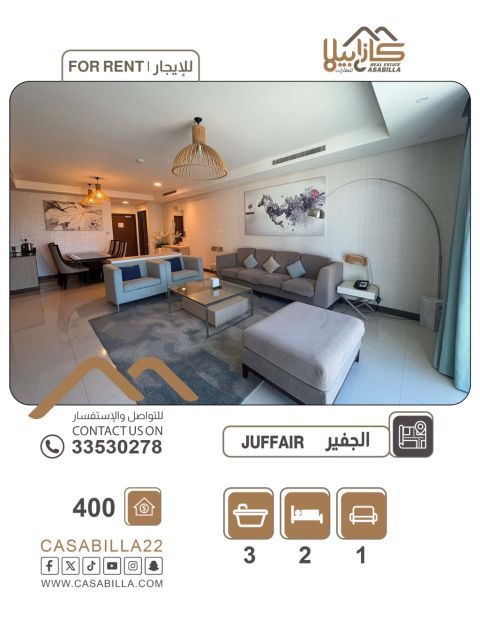 A fully furnished apartment for rent in Juffair, including electricity and water. The apartment features two bedrooms, four bathrooms, a living room, a kitchen, a parking space, a swimming pool, and a gym. The monthly rent starts from 430 Bahraini dinars, including electricity, water, and internet. For inquiries, please contact us at the following numbers: harbourbh, harbourrent - FR 01999.