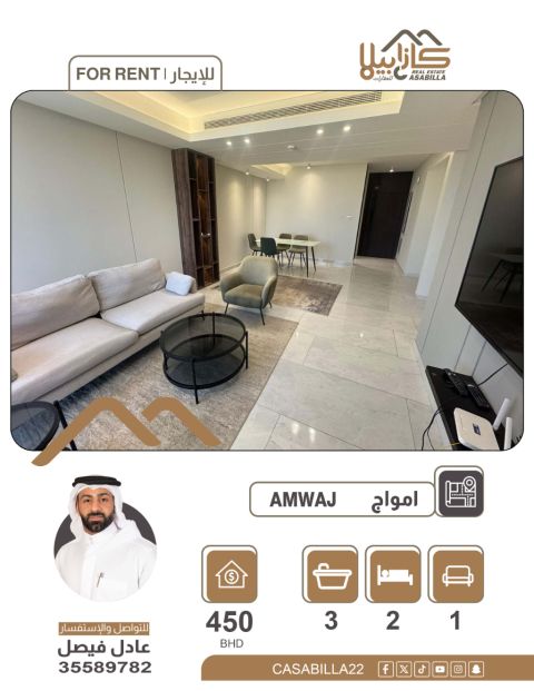 For rent, an apartment in Amwaj Islands. A distinctive apartment for rent in Amwaj Islands, located in a beautiful area and close to all services. Apartment specifications: 2 bedrooms - living room - 3 bathrooms - kitchen - prime location and close to services. Monthly rent 450 dinars. Electricity not included, 30 dinars. For contact and inquiries.