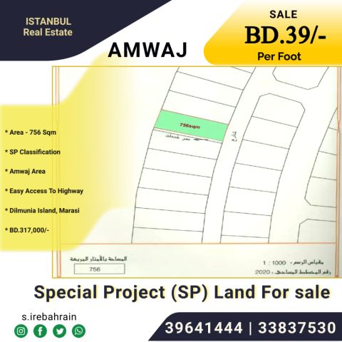 أرض مشروع خاص (SP) للبيع في أمواج بسعر 39 دينار بحريني للقدم المربع. تقع هذه الأرض الحصرية المطلة على البحر في أمواج بمساحة 756 متر مربع، مصنفة كأرض مشروع خاص، ويمكن استخدامها لأي مشاريع. سهولة الوصول الى الطريق السريع وجزيرة دلمونيا وديار المحرق وغير ذلك. نقدم 39 دينار بحريني للقدم المربع، وسيكون المجموع 317000 دينار بحريني