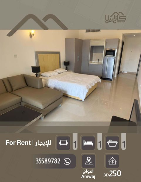 For rent: An apartment in Amwaj with an excellent location. Includes electricity and water, fully furnished, and includes internet. It consists of a large living room with a balcony, a kitchen, and two bathrooms. Rent is 280 (includes electricity). There is a parking space, services, a gym, a pool, and all recreational services. The pool is on the roof, on the top floor. For contact - Real Estate.
