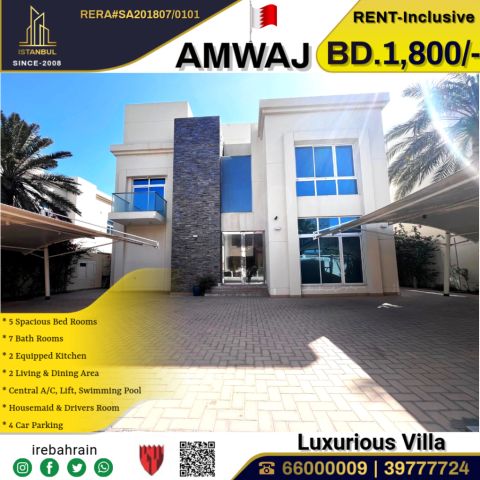 فيلا فاخرة نصف مفروشة للإيجار في جزيرة امواج - 1800 دينار بحريني شامل الفواتير. عش نمط الحياة المثالي للجزيرة. الموقع جزيرة امواج - مجتمع هادئ ومرموق. الإيجار 1800 دينار بحريني شهريا (يشمل فواتير الماء والكهرباء) 5 غرف نوم رئيسية، 7 حمامات، 4 مواقف سيارات. مميزات الفيلا مناطق واسعة للمعيشة وتناول الطعام، مطبخان مجهزان بالكامل، تصميم راقي ومتطور، غرفة خادمة، غرفة سائق، منطقة تخزين ومغسلة، خزائن