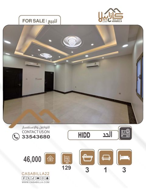 للبيع: شقة فخمة في الحد بموقع مميز بسعر 46 ألف دينار فقط. تفاصيل الشقة: 1 صالة عائلية واسعة مع حمام، 3 غرف نوم (غرفة ماستر)، 3 حمامات، 1 مطبخ. المرافق والخدمات: موقف سيارة مظلل، مكيفات سبليت، قرب الخدمات والمرافق العامة، قرب المسجد، قرب محطة البترول. المساحة والسعر: المساحة 129 متر مربع، السعر 46 ألف دينار، قابل للتفاوض.