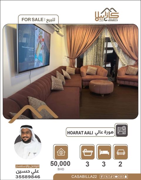 For sale: An apartment in the Al-Hadd New Area, close to all services. First, apartment details: 1 men's living room with a bathroom, 1 spacious family living room, 3 bedrooms including two master bedrooms, 4 bathrooms, 1 kitchen, 1 balcony. Second, facilities and services: Sewage system, shaded car parking, split air conditioners, proximity to services and public facilities, near a mosque. Third, areas: 200 square meters on engineering maps, 160 square meters in the document. Fourth, price: 64,000.
