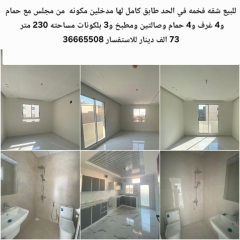 For sale: A luxurious apartment in Al-Hadd, a full floor with two entrances. It consists of a living room with a bathroom, 4 bedrooms, 4 bathrooms, two halls, a kitchen, and 3 balconies. Its area is 230 square meters for 73,000 dinars.