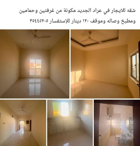 شقة للإيجار في الحد الجديد، مكونة من غرفتين وحمامين ومطبخ وصالة وموقف سيارة، بسعر 150 دينار، مناسبة للموظفين