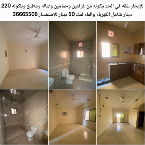 للإيجار شقة في الحد مكونة من غرفتين وحمامين وصالة ومطبخ وبلكونة بسعر 220 دينار، تشمل الكهرباء والماء حتى 50 دينار.