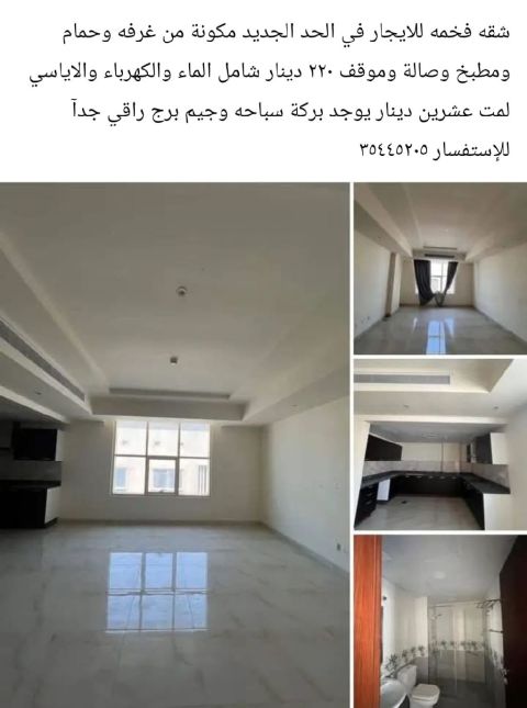 شقة فاخرة للإيجار في الحد الجديد، تتكون من غرفة نوم واحدة ومطبخ وحمام وصالة وموقف سيارات. الإيجار 220 دينار شامل الماء والكهرباء والمكيفات. المبنى يحتوي على بركة سباحة وصالة رياضية، وهو برج راق.