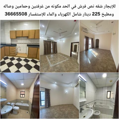 للإيجار شقة نصف مفروشة في الحد مكونة من غرفتين وحمامين وصالة ومطبخ بسعر 225 ديناراً شاملة الكهرباء والماء.
