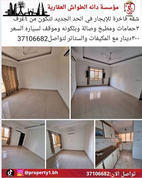 شقة فاخرة للإيجار في الحد الجديد تتكون من 4 غرف، 3 حمامات، مطبخ، صالة، بلكونه، وموقف سيارة. السعر 280 دينار مع المكيفات والستائر. للتواصل