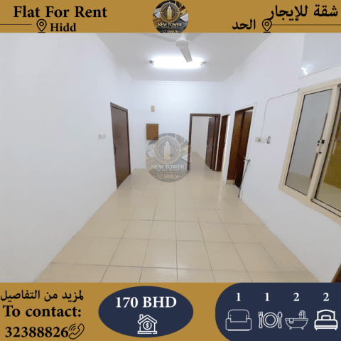 للإيجار شقة في الحد، غرفتين، حمامين، مطبخ، صالة، شاملة الكهرباء. السعر: 170 دينار بحريني. للتواصل.